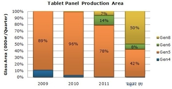 根據(jù)最新一季的季度大尺寸面板生產(chǎn)策略報(bào)告(Quarterly Large-Area Production Strategy Report)指出,在2011年前五代線為生產(chǎn)平板電腦面板(9”以上)面積最大的主要產(chǎn)線。然而,在2012年八代線將成為平板電腦面板最主要的生產(chǎn)工廠。