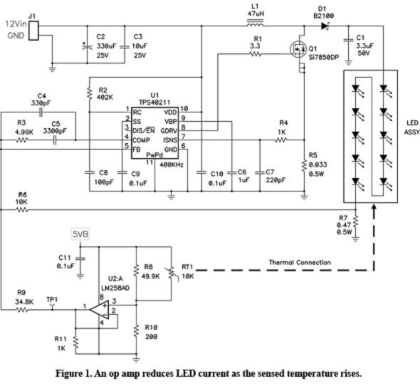 圖1 檢測溫度上升時運算放大器降低LED電流。