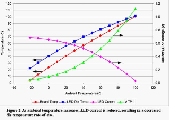 圖2 環(huán)境溫度上升,LED電流降低,從而達到更低的芯片溫升速率。