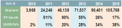 據(jù)NPD DisplaySearch調(diào)查液晶電視自2010年起開始走向3D影像應(yīng)用,并且不同品牌間在發(fā)展3D技術(shù)上存在差異。但不論是快門式或偏光式,消費(fèi)者對3D電視的接受度還有待考量,市場上仍然不能說已經(jīng)獲得了成功。2011年3D電視總出貨量約達(dá)2千4百萬臺,相較2億臺以上平板電視(包含液晶電視和等離子電視)的總出貨量而言,滲透率僅約11%,但成長率卻高達(dá)511%。比起2010年品牌間對3D技術(shù)的激烈攻防戰(zhàn),2011年的3D電視戰(zhàn)爭少了些硝煙味,特別是三星將主力放在智能電視,樂金持續(xù)對薄膜式3D電視加碼促銷,并與中國品牌達(dá)成聯(lián)合戰(zhàn)線,將薄膜式3D技術(shù)的市場占有率逐漸提高。