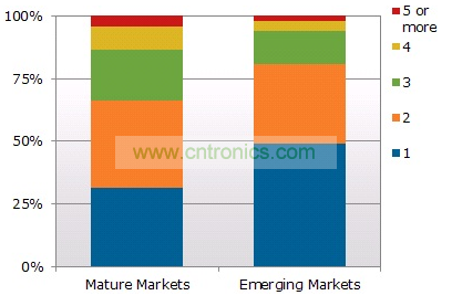 該報告還發(fā)現(xiàn),在成熟市場家庭平均擁有2.4臺電視,而在新興市場平均每戶為1.8臺。成熟市場中,超過三分之二的家庭有一臺以上電視,但在新興市場近一半的家庭只有一臺電視。鑒于平板電視持續(xù)推出新機種、價格益加實惠、以及消費者對高品質(zhì)、大屏幕和高清晰度電視的消費欲望,和成熟市場的消費者一樣,越來越多的新興市場消費者購買平板電視(主要是液晶電視)來汰換他們現(xiàn)有的舊款式電視。