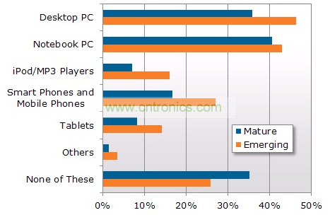 NPD DisplaySearch全球電視消費者換機調(diào)查還對家庭戶進行了關(guān)于在其他設(shè)備上收看電視視頻節(jié)目的調(diào)研,發(fā)現(xiàn)在新興市場越來越多的家庭使用除電視以外的設(shè)備,包括平板電腦、智能手機和MP3播放器。