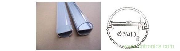 內(nèi)置電源的另一個最大缺點是壽命低。因為電源必須放在鋁管里,所以鋁管不可能做成鰭片的形式,而只能是普通的半圓柱型,頂多在表面上加上一些很淺的條形溝槽(圖4)。