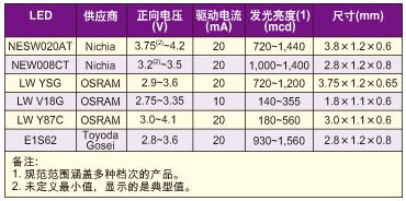 LED技術持續(xù)快速改進,制造商在使用新的材料、制造技術和LED設計來為同等大小的電流釋出更大的光輸出,這樣一來,幾年前需要4個LED進行背光的顯示屏如今可能采用2個LED就能實現(xiàn)同樣的背光亮度。不僅如此,過去通常使用冷陰極熒光燈(CCFL)進行背光的4到7英寸較大顯示屏,如今正在轉(zhuǎn)向使用LED進行背光。此外,LED的正向電壓正趨向更低。因此,不僅需要考慮驅(qū)動器制造商的數(shù)據(jù)表曲線上的驅(qū)動器效率,還需要基于采用所選LED對驅(qū)動器進行的評估來予以考慮。表1列舉了幾款LED的一些重要規(guī)范,顯示了這些LED在正向電壓和發(fā)光亮度等方面的差別。需要說明的是,正向電壓范圍的變化較大,這意味著驅(qū)動器的效率應該采用LED規(guī)范的極限值來進行評估。