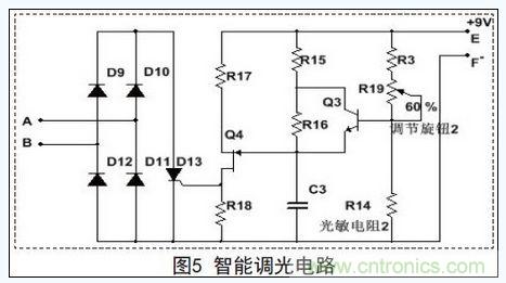 當(dāng)LED照明設(shè)備開始工作后,本文設(shè)計的智能開關(guān)會依據(jù)環(huán)境照明情況的變化,通過智能調(diào)光電路自動地改變照明設(shè)備的亮度。圖1所示的智能調(diào)光電路接口A、B接入的電路如圖5所示。