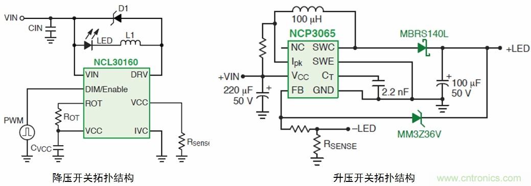 用于中等電壓通用照明的開關(guān)驅(qū)動器有多種拓?fù)?,如降壓、升壓;降?升壓的NCP3065和NCP3066(可以配置為控制器)、NCP3163、MC33163、NCP1294;降壓的CAT4201、NCP1034、NCL30100、NCL30105、NCL30160、NCL30161;此外還有升壓或SEPIC的CS5171/3。
