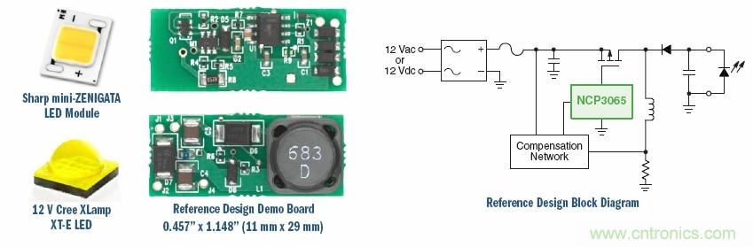對于3至4個LED模塊的12 V AC-DC設(shè)計,可以使用安森美半導(dǎo)體針對NCP3065的評估板NCP3065BBGEVB,用來驅(qū)動12 Vac/Vdc應(yīng)用中的夏普ZENIGATA™、Cree XLamp™MC-E及其他LED模塊。其特點(diǎn)是小尺寸、寬輸入和輸出工作電壓,輸出電流經(jīng)過穩(wěn)流,還具有LED開路保護(hù)、輸出短路保護(hù)能力。該解決方案適用于MR16燈泡、景觀照明、交通照明。