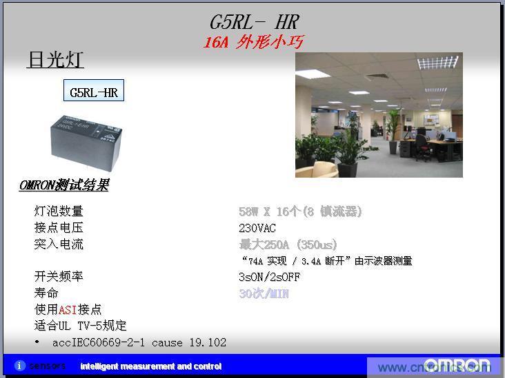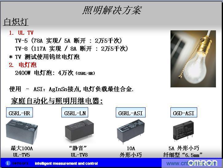 我們實際客戶應(yīng)用的案例,我們在推廣客戶的過程中,形成了一些實際的應(yīng)用案例,在實現(xiàn)照明系統(tǒng)和家電自動化的領(lǐng)域,在節(jié)能領(lǐng)域、自動化的領(lǐng)域現(xiàn)在是越來越高了,目前歐姆龍的繼電器在日光燈這塊直接的應(yīng)用可以運用繼電器作為啟用的電阻。繼電器也就是高級一點的器開關(guān)。在模塊上面,也是用來控制鎮(zhèn)流器的。在另外一個人體、物體探照這塊,我們也會有MEMS非接觸系統(tǒng)的微溫度傳感器。按照設(shè)計的過程中,就是在信號繼電器和MEMS非接觸溫度傳感器繼電器上都有應(yīng)用,但是還沒有成功案例,所以上面就打了問號。