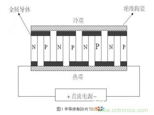 半導(dǎo)體制冷又稱電子制冷,或者溫差電制冷,是從50年代發(fā)展起來(lái)的一門介于制冷技術(shù)和半導(dǎo)體技術(shù)邊緣的學(xué)科,與壓縮式制冷和吸收式制冷并稱為世界三大制冷方式。半導(dǎo)體制冷器的基本器件是熱電偶對(duì),即把一只N型半導(dǎo)體和一只P型半導(dǎo)體連接成熱電偶(如圖1),通上直流電后,在接口處就會(huì)產(chǎn)生溫差和熱量的轉(zhuǎn)移。在電路上串聯(lián)起若干對(duì)半導(dǎo)體熱電偶對(duì),而傳熱方面是并聯(lián)的,這樣就構(gòu)成了一個(gè)常見(jiàn)的制冷熱電堆。借助于熱交換器等各種傳熱手段,是熱電堆的熱端不斷散熱并且保持一定的溫度,而把熱電堆的冷端放到工作環(huán)境中去吸熱降溫,這就是半導(dǎo)體制冷的原理。