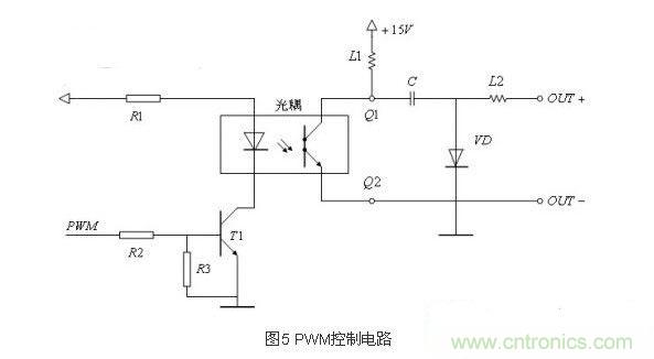 限于篇幅有限,下面僅對(duì)此PWM控制電路進(jìn)行簡(jiǎn)單的介紹:當(dāng)PWM控制信號(hào)為低電平時(shí),晶體管T1處于截止?fàn)顟B(tài),光電耦合器中發(fā)光二極管的電流近似為零,輸出端Q1和Q2間的電阻很大,相當(dāng)于開(kāi)關(guān)“斷開(kāi)”;當(dāng)PWM波控制信號(hào)為高電平時(shí),晶體管T1處于導(dǎo)通狀態(tài),光電耦合器中發(fā)光二極管發(fā)光,輸出端Q1和Q2間的電阻很小,相當(dāng)于開(kāi)關(guān)“導(dǎo)通”.由上面介紹可知,當(dāng)DS18B20采集的實(shí)時(shí)溫度小于制冷啟動(dòng)溫度時(shí),光電耦合器的PWM輸入端無(wú)信號(hào)輸入時(shí),光電耦合器處于不工作狀態(tài),圖5中的OUT+端和OUT-端無(wú)輸出電壓,即半導(dǎo)體制冷片處于閑置狀態(tài);當(dāng)DS18B20采集的實(shí)時(shí)溫度大于制冷啟動(dòng)溫度時(shí),光電耦合器的PWM輸入端有信號(hào)輸入,圖5中的OUT+端和OUT-端即有輸出電壓。通過(guò)PWM調(diào)制波控制Q1和Q2兩端的通斷,即可實(shí)現(xiàn)對(duì)半導(dǎo)體制冷片TEC工作電壓的控制,進(jìn)而控制了半導(dǎo)體制冷片TEC的散熱功率。圖5中的OUT+端和OUT-端分別接在半導(dǎo)體制冷片TEC的輸入端線上。根據(jù)CUK電路的輸出電壓和供電電源電壓的關(guān)系,可得出PWM波占空比和半導(dǎo)體制冷片TEC輸入電壓的關(guān)系: