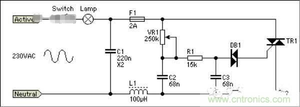 前沿切相調(diào)光器電路比較簡單,一般都包含一個DIAC(雙向觸發(fā)二極管),一個TRIAC(可控硅,因此也叫可控硅調(diào)光器)。