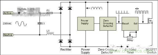 同樣,如圖所示,L1、C1起RF抑制作用。電路中有過零檢測和計時器,過零檢測到過零時重置計時器,且使計時器輸出高電壓,開啟MOSFET,電路導通,計時器開始計時,經(jīng)過設定時間(ms,小于半周期)后,計時器輸出低電平,MOSFET關閉。電壓輸出中斷。
