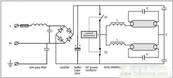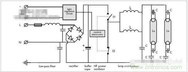 熒光燈的調(diào)光(1-10V)熒光燈的調(diào)光是在高頻電子鎮(zhèn)流器的基礎上研發(fā)出來的。下面是高頻電子鎮(zhèn)流器的線路圖: