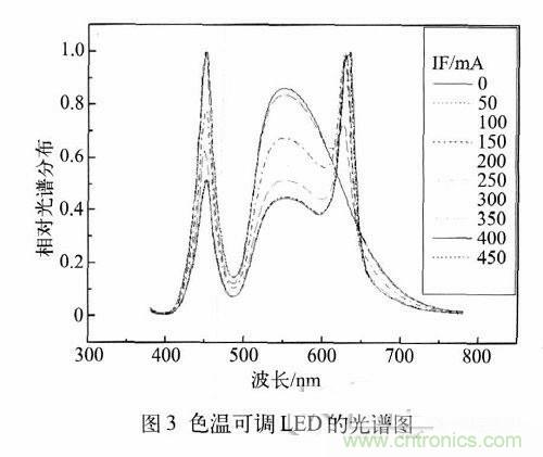 圖3為采用遠(yuǎn)方HASS-2000高精度快速光譜輻射計(jì)測量得到的色溫可調(diào)LED的光譜圖,從圖中可以看出,隨著紅光LED電流的變化(從0到450mA),LED的相對(duì)光譜也會(huì)隨之變化,LED的光譜有三個(gè)峰值,分別在450nm、550nm和628nm,暖色溫的發(fā)光效率大于68lm/W,冷色溫的發(fā)光效率達(dá)到87lm/W。