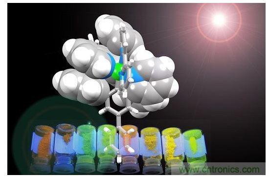 銥金屬中心被包覆在一種有機外殼,為LEC提供保護(hù)作用。這種外殼的精確化學(xué)結(jié)構(gòu)讓研究人員們得以調(diào)整發(fā)光的色彩。(來源:University of Basel)