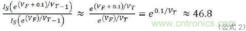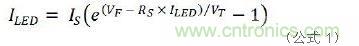 下面是圖1a行不通的原因所在。在公式1中,IS、RS是常數(shù),取決于LED產(chǎn)品本身,與VT是熱電壓無關。假設串聯(lián)電阻RS是理想值零,那么僅0.1V的VF變化就會產(chǎn)生47倍的ILED差異。