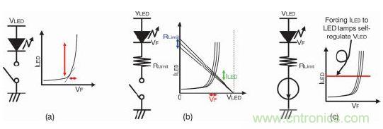 現(xiàn)在我們來看看圖1b。添加一個限流電阻器RLIMIT來保護LED燈。由于有限流電阻器,因此該燈不會被燒壞。在視頻顯示器應用領域,這種方法在控制LED光強度方面仍然不夠好。LED曲線和RLIMIT產(chǎn)生的負載曲線可決定其LED電流值。如紅色或藍色標記所示,該LED和電阻器分別存在制造誤差造成的正向電壓變化及電阻變化。這些誤差因素會使LED電流(綠)產(chǎn)生不可忽視的變化。