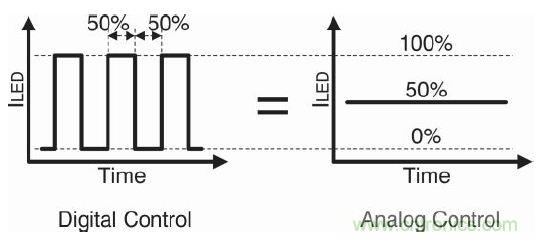 首先應決定使用數(shù)字控制還是模擬控制。前面已經(jīng)介紹過,經(jīng)過 PN 結點的總電荷數(shù)可決定光強度,因此數(shù)字和模擬方法均可控制光強度。圖3是數(shù)字和模擬法中的50%灰階控制。在總體256個色階的示例中,該50%表明了一個有128個灰階的目標。