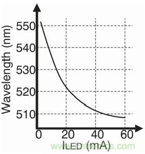 這時候,需要考慮電流變化對LED光輸出波長值的影響。改變波長就意味著改變人眼看到的色彩。圖4是綠色LED燈的實例。通常在業(yè)界,510nm 廣泛代表綠色。因此,大部分LED燈制造商所設計的LED燈產(chǎn)品在最大額定電流下都具備510nm的波長。在圖4中,隨著LED電流的升高,波長可達到510nm。獲得綠色的最佳方法是盡量使燈的驅動電流接近最大額定值。這也就說明了為什么使用數(shù)字控制比使用模擬控制好。