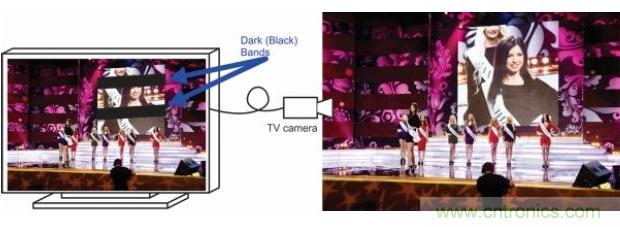 老式模擬電視通常在一秒鐘內顯示24張不同的靜態(tài)影像,幀速率為24。當模擬電視攝像機拍攝另一個模擬電視屏幕時,可產(chǎn)生由視頻影像與黑色條帶構成的斑馬紋混合畫面(圖9)。這種現(xiàn)象由同步電視攝像機和電視屏幕掃描率引起。在拍攝LED屏幕的攝像機采用時分復用陽極驅動器時,也會出現(xiàn)相同的問題。應用實例包括使用電視攝像機拍攝背景墻壁上由LED顯示器放大演員的舞臺影像或者用電視攝像機拍攝體育場中體育賽事比分牌或標牌等。要避免這個問題,LED顯示器現(xiàn)在需要比攝像機系統(tǒng)運行得更快,特別是在專用LED顯示器市場。