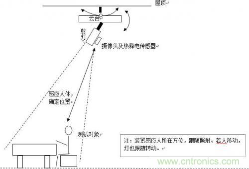模型設(shè)計為,在一個房間的天花板處安裝此系統(tǒng),當(dāng)一個人進入房間時,系統(tǒng)可以自動識別有人進入房間,led射燈打開并照亮人所在位置(及其周邊一定區(qū)域);當(dāng)人在房間里移動時,位于系統(tǒng)云臺上射燈發(fā)射的燈光會跟隨人體運動。