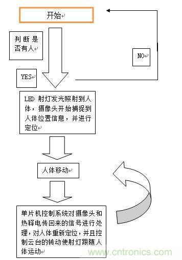 系統(tǒng)初始化之后,對狀態(tài)進行判斷,若沒檢測到人,則一直處于檢測狀態(tài);若檢測到有人,則單片機控制IO口打開開關(guān)使得LED射燈發(fā)光照射到人體,攝像頭開始捕捉人體位置信息,并進行定位;當(dāng)人體移動時,單片機控制系統(tǒng)對熱釋電和攝像頭傳回來的信號進行處理,對人體重新進行定位,并且控制云臺轉(zhuǎn)動使射燈跟隨人體運動;當(dāng)人體再移動,便繼續(xù)“人體移動----數(shù)據(jù)處理---轉(zhuǎn)動云臺”這個循環(huán)過程。