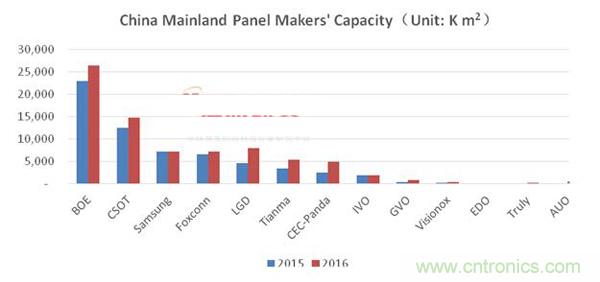 圖二:中國(guó)大陸面板廠商2015-2016年產(chǎn)能變化情況