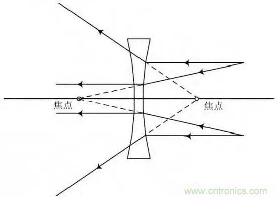 由于紫外光的散射傳播特性,UV LED的視場角和檢測器的視場角重疊的區(qū)域越大,接收到的光能量就越多,接收信噪比就越高??紤]到系統(tǒng)選用的UV?LED的視場角只有10°,為了增大收發(fā)雙方在存在視線遮擋情況下的重疊區(qū)域,需要通過光學透鏡增大發(fā)送光源的視場角。凹透鏡能夠?qū)θ肷涔馐鸢l(fā)散作用,如圖2所示,所以通過多個凹透鏡的組合并調(diào)節(jié)UV?LED和凹透鏡的距離,就可以得到滿足要求的發(fā)射視場角。