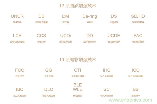 當(dāng)然,它也關(guān)畫質(zhì)有那么一點事。因為大部分的電視ARM芯片也都集成了畫質(zhì)引擎技術(shù),比如下圖所出現(xiàn)的,有百分之九十的人都不會看完的各種高大上的技術(shù)術(shù)語。不要以為這些技術(shù)很牛,是電視廠商搞出的什么新鮮玩意兒,其實這只是一個多合一芯片集成了所有的接口,也就是說只要是同一芯片方案的電視機(jī)連底層程序都是一樣的,沒有絲毫的獨(dú)特性。