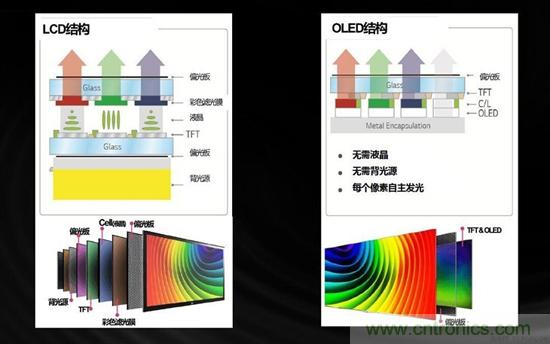 如果將OLED與傳統(tǒng)LCD結(jié)構(gòu)進行對比,OLED最大的特點是無需液晶、無需背光源和每個像素都能自主發(fā)光,從圖中看OLED的結(jié)構(gòu)的確更加簡單,而正是這樣的結(jié)構(gòu)設計讓它有了超越傳統(tǒng)的優(yōu)異表現(xiàn)。