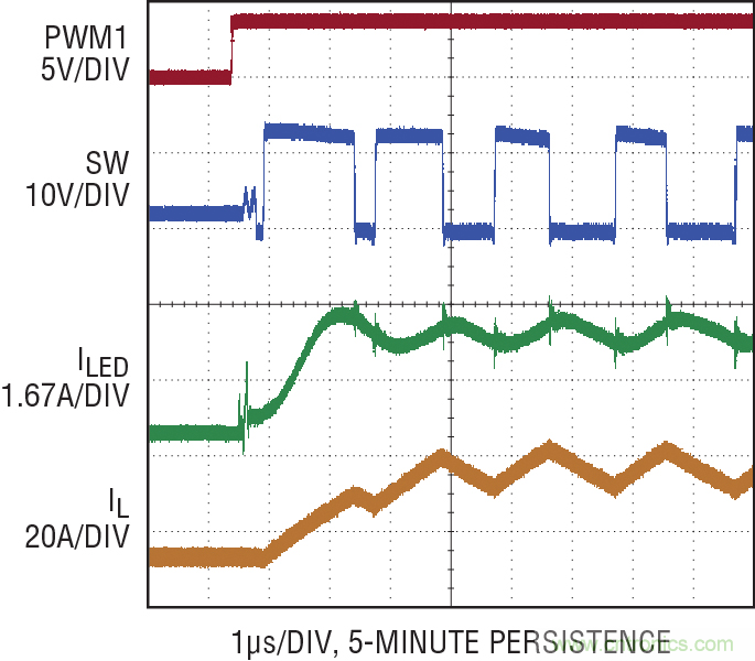 衡量 LED 驅(qū)動器性能的最重要指標(biāo)之一是 LED 電流在 PWM 調(diào)光時(shí)的恢復(fù)速度。在 PWM 接通信號上升沿之后的頭幾個(gè)開關(guān)周期中,驅(qū)動器的表現(xiàn)對最終產(chǎn)品的質(zhì)量有很大影響。LT3744 采用專有 PWM、補(bǔ)償和時(shí)鐘同步技術(shù),提供無閃爍性能,甚至在驅(qū)動 LED 至 20A 電流時(shí)也是如此。