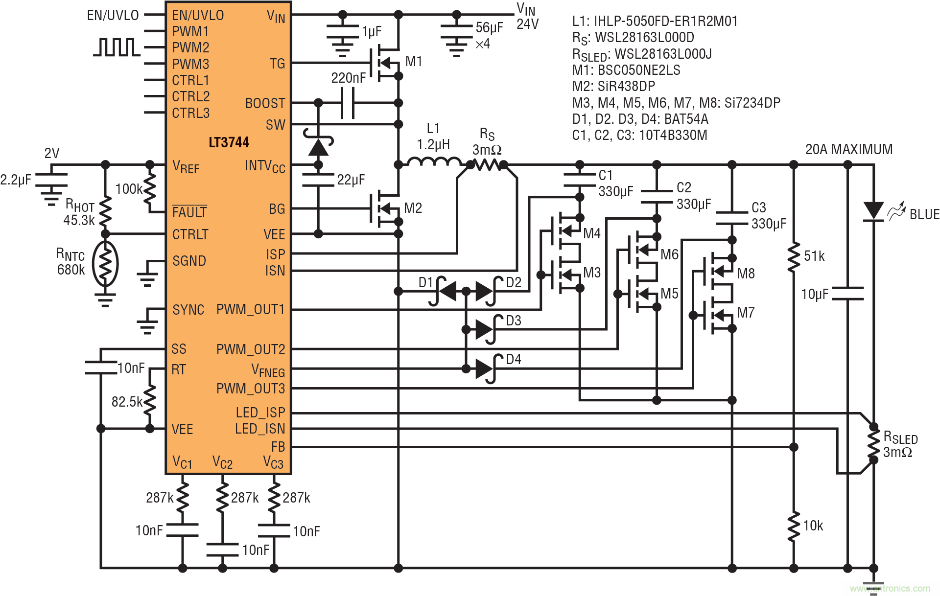 圖 14:并聯(lián)負(fù)輸出應(yīng)用向連接到系統(tǒng)外殼的公共陽極 LED 提供 120W 功率。
