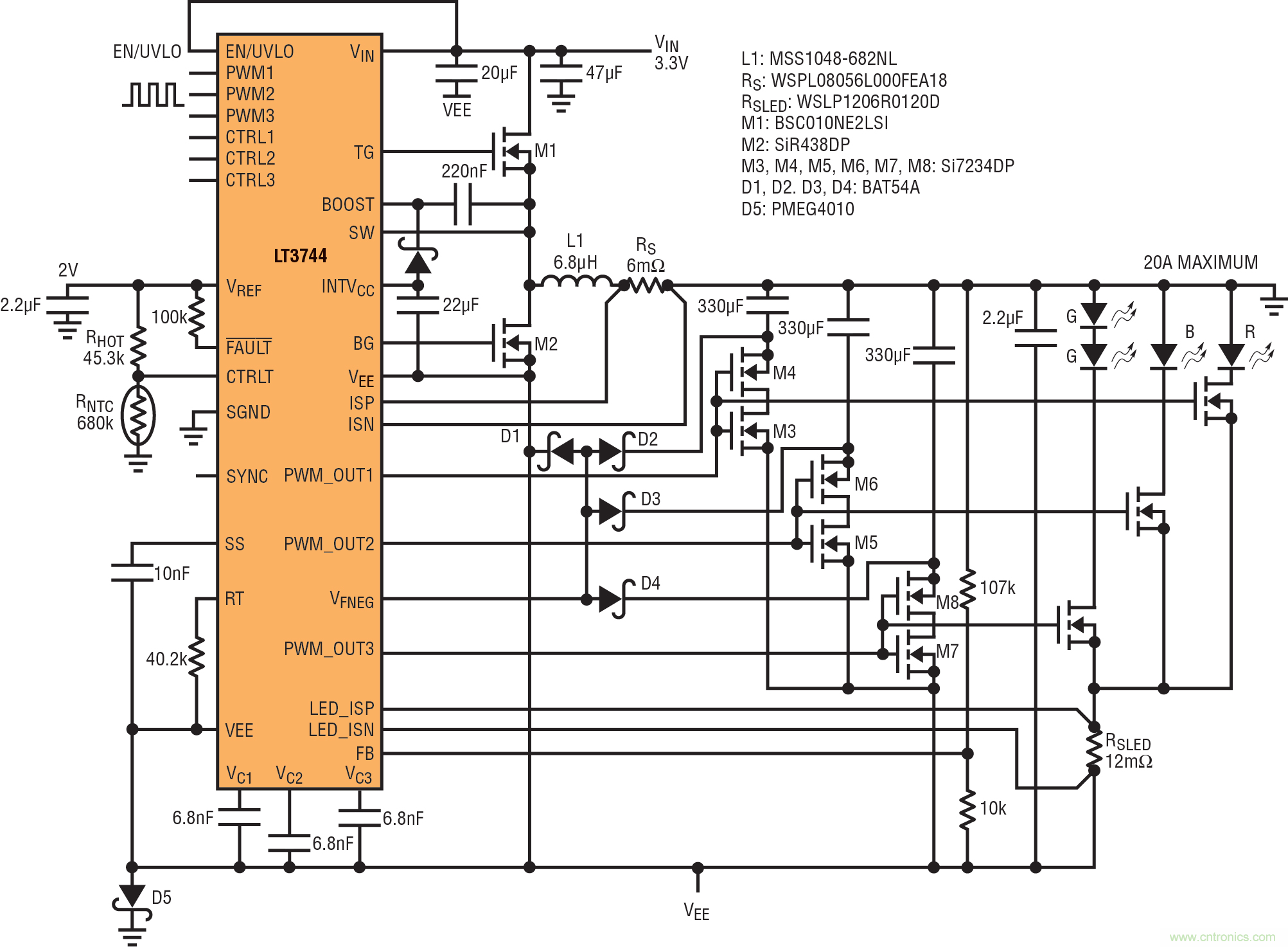 每個(gè) LED 都可以順序接通,相互之間有一定的時(shí)間延遲,或者按照提供給 PWM 數(shù)字輸入的任何模式接通。此外,憑借 3 個(gè)獨(dú)立的模擬控制輸入,每個(gè) LED 都能夠以不同的穩(wěn)定電流運(yùn)行。當(dāng) LT3744 配置為負(fù)輸出降壓-升壓型轉(zhuǎn)換器時(shí),單節(jié)鋰離子電池僅用單個(gè)控制器就可以驅(qū)動 3 個(gè)獨(dú)立的 LED 串。圖 7 顯示了一個(gè)專門為 RGB 微型投影儀設(shè)計(jì)的 3.3V/5A 負(fù)輸出、3 色、降壓-升壓型 LED 驅(qū)動器。