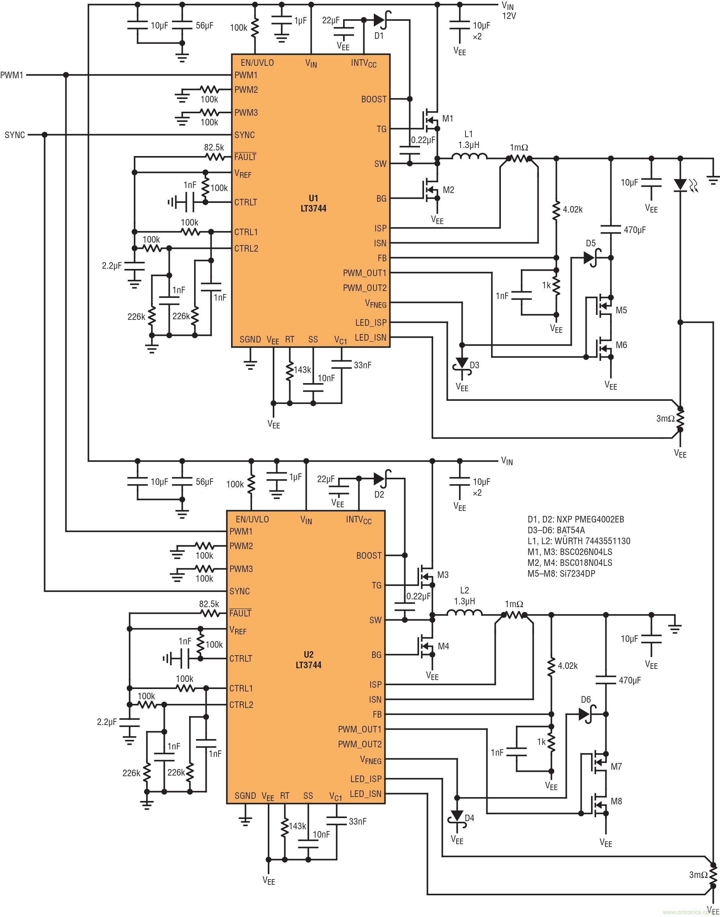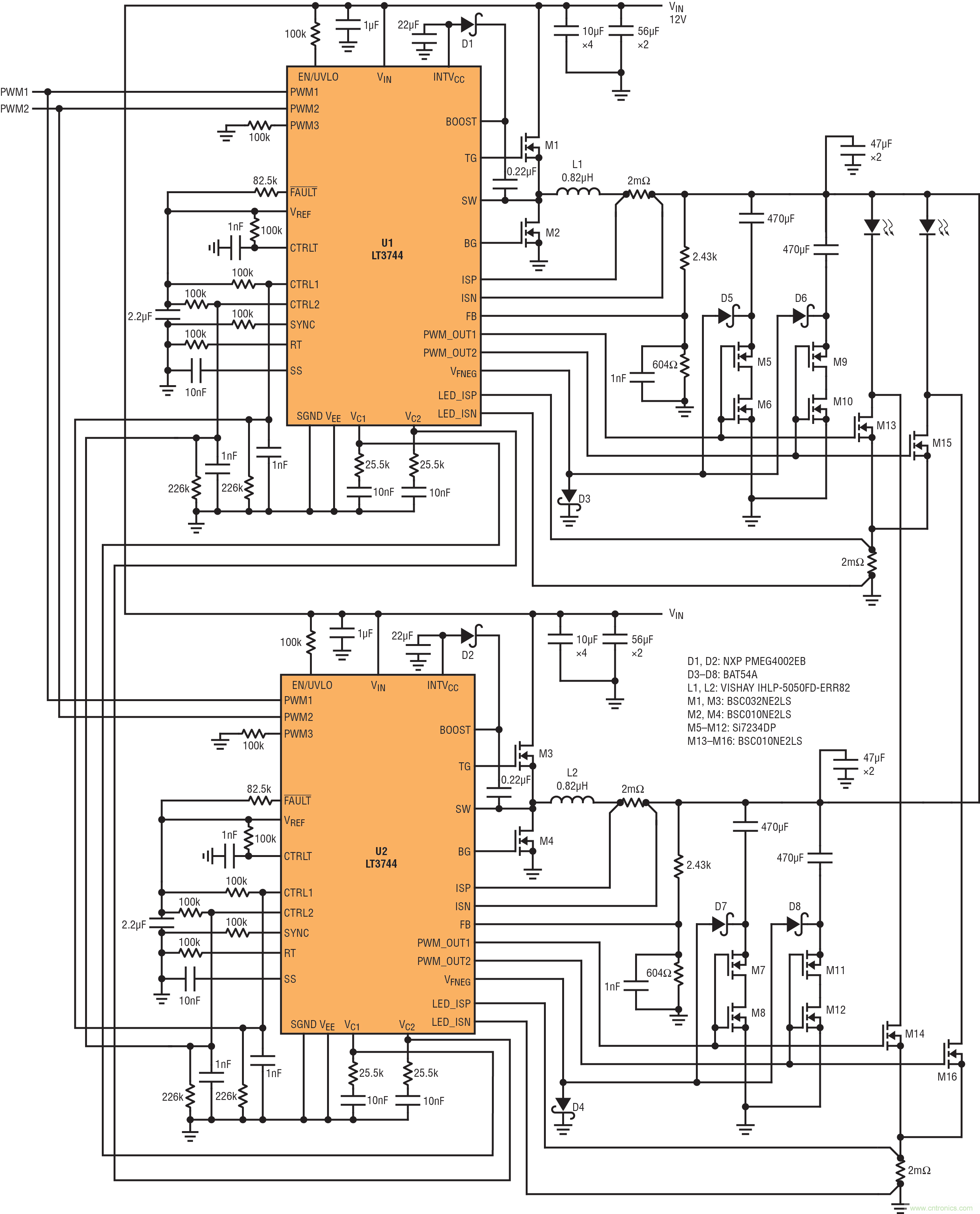 兩個(gè) LT3744 LED 驅(qū)動器并聯(lián)以組成 324W 雙 LED 驅(qū)動器