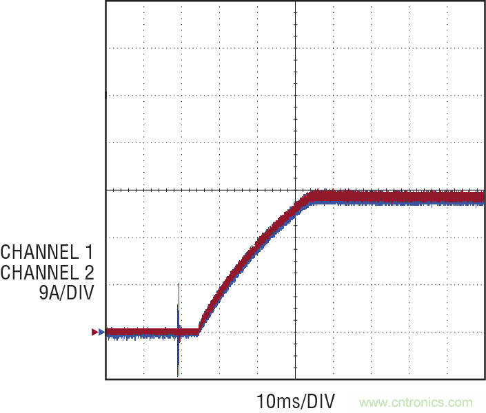 圖 8 顯示了一款 324W 轉(zhuǎn)換器,由兩個(gè)ADI DC2339A 演示電路板并聯(lián)組成。在這款設(shè)計(jì)中,每個(gè)并聯(lián)的控制器都產(chǎn)生 27A 電流,總共產(chǎn)生 54A 電流,電壓為 6V。通過將相應(yīng)的補(bǔ)償輸出連接到一起,兩個(gè)控制器協(xié)調(diào)一致地運(yùn)行,以提供平滑、良好的啟動和準(zhǔn)確的 DC 調(diào)節(jié)。