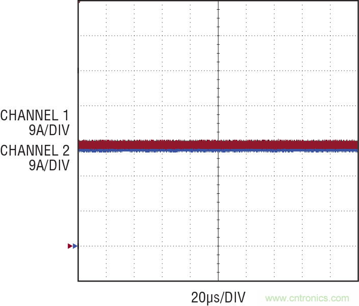圖 10:在滿負(fù)載時(shí) LED DC 電流均分,兩個(gè)并聯(lián)驅(qū)動器之間的電流差別非常小。