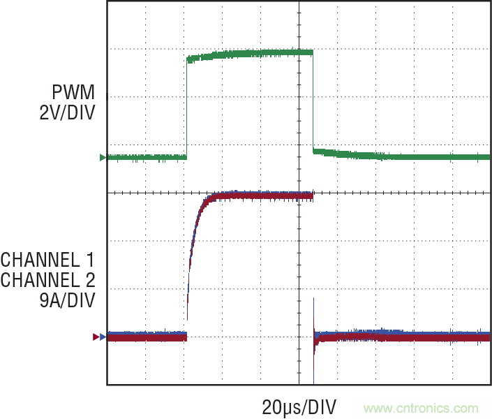 圖 12:在進(jìn)行 PWM 調(diào)光時(shí),LT3744 的并聯(lián)驅(qū)動器之間實(shí)現(xiàn)了出色的 LED 電流均分。