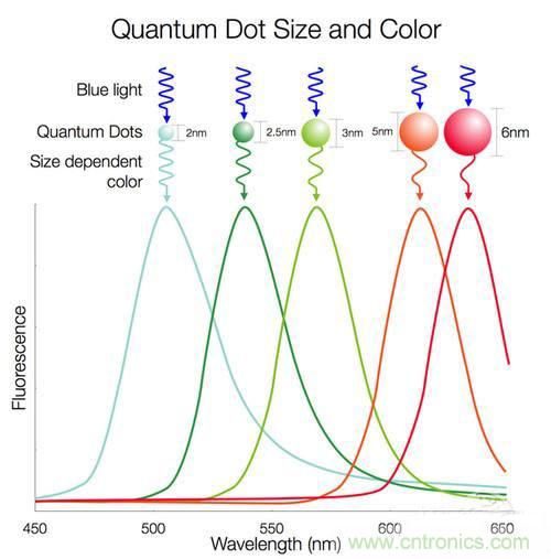 不同大小尺寸的量子點(diǎn)會(huì)發(fā)出不同的顏色,量子點(diǎn)當(dāng)受到光或電的刺激時(shí),就發(fā)出有色光線,光線的顏色由量子點(diǎn)的組成材料和大小形狀決定,一般顆粒越小,會(huì)吸收長(zhǎng)波,顆粒越大,會(huì)吸收短波。