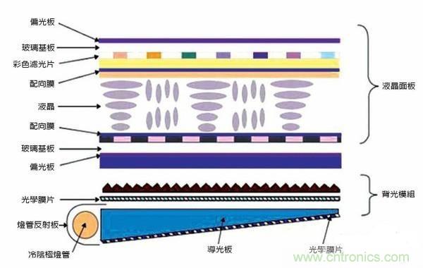 我們先來看看歷史已久的LCD顯示技術(shù),LCD顯示屏結(jié)構(gòu)非常復(fù)雜,LCD 的構(gòu)造是在兩片平行的玻璃基板當(dāng)中放置液晶盒,下基板玻璃上設(shè)置TFT(薄膜晶體管),上基板玻璃上設(shè)置彩色濾光片,通過TFT上的信號(hào)與電壓改變來控制液晶分子的轉(zhuǎn)動(dòng)方向,從而達(dá)到控制每個(gè)像素點(diǎn)偏振光出射與否而達(dá)到顯示目的。