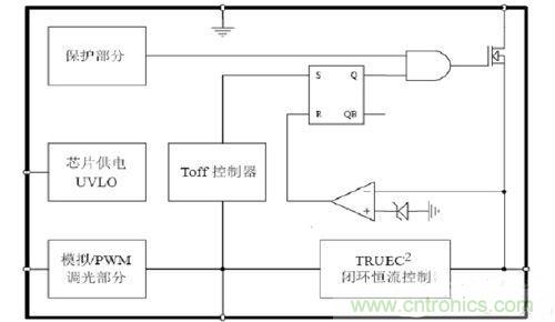 所謂開環(huán),不以檢測(cè)到的輸出電流值來做發(fā)出PWM信號(hào)的參考。所謂的閉環(huán),即真正檢測(cè)輸出電流值,以此為標(biāo)準(zhǔn)來發(fā)出PWM信號(hào)。從電路拓?fù)渖?,二者沒有區(qū)別。但是在芯片內(nèi)部對(duì)檢測(cè)到的如圖1 CS腳電感電流信號(hào),做專利技術(shù)處理,如圖2 TRUEC2部分。這樣,就檢測(cè)到了電感電流的平均值,也就是輸出電流的平均值。芯片針對(duì)檢測(cè)到的值,控制輸出占空比,實(shí)現(xiàn)了閉環(huán)控制。