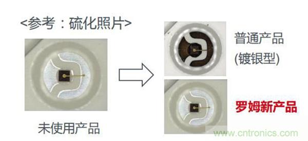 通過對比得出ROHM新產品的優(yōu)勢:一是能保持亮度,二保護芯片鍵合材料不受損壞,三無需其他保護對策。