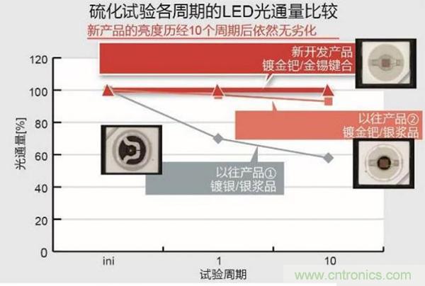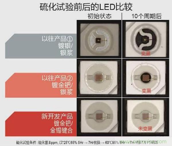 在硫化試驗中,以往使用鍍銀框架及銀漿的產品的光通量在一個周期(24小時)后為70%,10個周期后為60%,時間越長其光通量越低;而新產品可在10個循環(huán)(240小時)后依然保持幾乎100%的高光通量 。