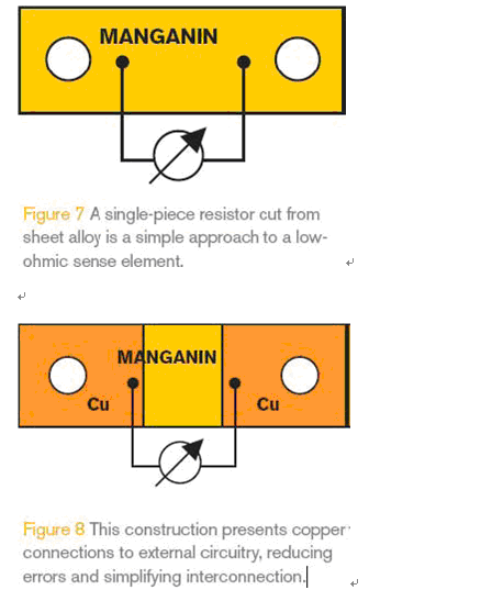 四引線設計推薦用于大電流和低阻值應用。通常的做法使用錳鎳銅合金帶直接沖壓成電阻器(圖7),但這不是最好的辦法。盡管四引線電阻有利于改進溫度特性和熱電壓,但總阻值有時高出實際阻值2到3倍,這會導致難以接受的功率損耗和溫升。此外,電阻材料很難通過螺絲或焊接與銅連接,也會增加接觸電阻以及造成更大的損耗。