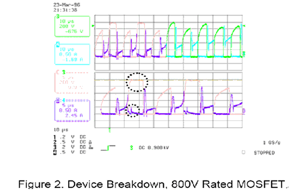當場效應晶體管進入崩潰效應時 Drain 及 Source 電壓會被嵌制在其崩潰電壓 , 而電流會經(jīng)由寄生的二極管而產(chǎn)生逆向操作電流的現(xiàn)象。如圖二所示為一典型開關式電源電路所量測到的崩潰現(xiàn)象。從圖中可看出 Drain 及 Source 的電壓 (CH3) 被箝制在 1KV 而且逆向電流 (CH4) 可清楚地被發(fā)現(xiàn)。