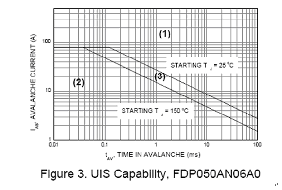 UIS 的評估方式是針對崩潰現(xiàn)象分析的一種很有用的方法。在圖三 UIS 安全工作區(qū)域中可區(qū)分為三大區(qū)域 (1) 大于 25 ° C 線或者是圖中靠右的區(qū)域 , (2) 低于 150 ° C線或者是圖中靠左的區(qū)域 , (3) 介于 (1) 與 (2) 的區(qū)域。其中 (1) 可清楚地了解此組件工作超出額定工作范圍之外 (2) 則是位于額定工作范圍之內(nèi)。至于 (3) 的區(qū)域界定 我們需要得到此組件的起始 UIS 接合面溫度以決定其工作能力。稍后會在后面舉例說明如何求出此接合面溫度。
