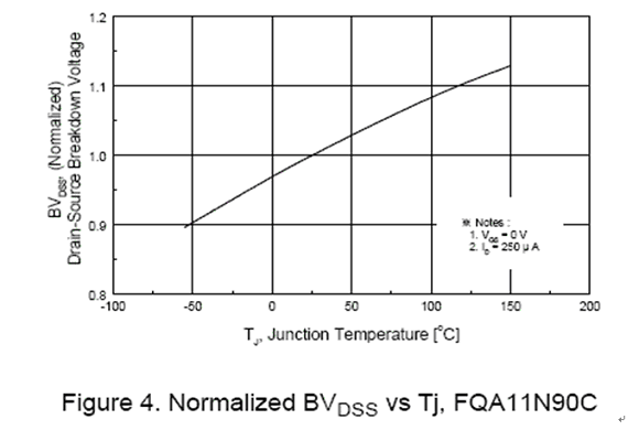 一般而言 假使 Drain 及 Source 電壓超過規(guī)格書所載明的最大額定電壓稍大一些 , 此時要讓場效應晶體管產(chǎn)生崩潰現(xiàn)象其實是不常發(fā)生的。圖四所表示的曲線為場效應晶體管的額定最大工作電壓 (BVDSS) vs 接合面溫度 (Tj), 其特性的表示是以正溫度特性變化 。當接合面溫度達到 120 ° C 時 , BVDSS 可達到將近 990V 。由此可知 , 在更高的接合面溫度條件下 , 場效應晶體管需要更高的 Drain 對 Source 的電壓以達到崩潰效應產(chǎn)生的必要條件。