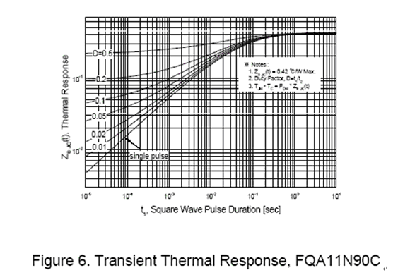 舉例說明 , 當一個 2KW 的電源脈沖加至 FQA11N90 的脈沖時間為 1uS 時 , 我們可依據(jù)圖六的曲線算出此脈沖功率對接合面所產(chǎn)生的溫升為
