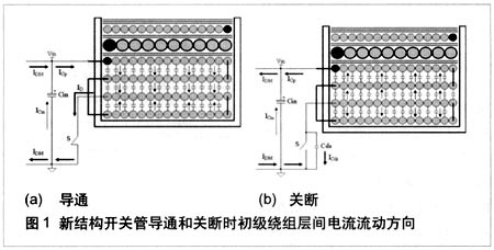 對(duì)于常規(guī)的4層初級(jí)繞組結(jié)構(gòu),在開(kāi)關(guān)管導(dǎo)通和關(guān)斷的過(guò)程中,層間的電流向同一個(gè)方向流動(dòng)。在圖1中,在開(kāi)關(guān)管導(dǎo)通時(shí),源極接到初級(jí)的地,B點(diǎn)電壓為0,A點(diǎn)電壓為Vin,基于電壓的變化方向,初級(jí)繞組層間電容中電流流動(dòng)方向向下,累積形成的差模電流值大。在功率器件關(guān)斷瞬間,MOSFET漏-源極電容充電,變壓器初級(jí)繞組的層間電容放電,這兩部分電流也會(huì)形成差模電流。同樣,基于電壓的變化方向,初級(jí)繞組層間電容中的電流流動(dòng)方向向上,累積形成的差模電流值大。