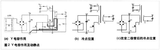 共模電流在輸入及輸出線與大地間流動(dòng),主要有下面幾部分:通過(guò)MOSFET源級(jí)到大地的電容Cde。如果改進(jìn)IC的設(shè)計(jì),如對(duì)于單芯片電源芯片,將MOSFET源極連接到芯片基極,用于散熱,而不是用漏極進(jìn)行散熱,這樣可以減小漏極對(duì)大地的寄生電容。PCB布線時(shí)減小漏極區(qū)銅皮的面積可減小漏極對(duì)大地的寄生電容,但要注意保證芯片的溫度滿足設(shè)計(jì)的要求;通過(guò)Cm 和Cme產(chǎn)生共模電流;通過(guò)Ca和 Cme產(chǎn)生共模電流;通過(guò)Ct和Coe產(chǎn)生共模電流;通過(guò)Cs和Coe產(chǎn)生共模電流,這部分在共模電流中占主導(dǎo)作用。減小漏極電壓的變化幅值及變化率可減小共模電流,如降低反射電壓,加大漏-源極電容,但這樣會(huì)使MOSFET承受大的電流應(yīng)力,其溫度將增加,同時(shí)加大漏-源極電容,產(chǎn)生更強(qiáng)的磁場(chǎng)。如果系統(tǒng)加了Y電容,如圖2所示,通過(guò)Cs的大部分共模電流被Y 電容旁路,返回到初級(jí)的地,因?yàn)閅電容的值大于Coe。Y電容必須直接并用盡量短的直線連接到初級(jí)和次級(jí)的冷點(diǎn)。如果導(dǎo)通時(shí)MOSFET的dV/dt大于關(guān)斷時(shí)的值,Y電容則連接到初級(jí)的地,反之連接到Vin。