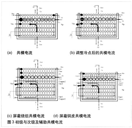 如果在內(nèi)層及初級(jí)、次級(jí)繞組間放置銅皮,銅皮的寬度小于或等于初級(jí)繞組的寬度,銅皮的中點(diǎn)由導(dǎo)線連到冷點(diǎn),如圖3(c)所示,由于銅皮為冷點(diǎn),與其接觸的繞組和銅皮間電壓的擺率降低,從而減小共模電流,同時(shí)將共模電流由銅皮旁路引入到冷點(diǎn)。注意銅皮的搭接處不能短路,用絕緣膠帶隔開(kāi),內(nèi)外層銅皮的方向要一致。輔助繞組和次級(jí)繞組的共模電流可以由以下方法補(bǔ)償:① 加輔助屏蔽繞組:輔助屏蔽繞組繞制方向與次級(jí)繞組保持一致,輔助屏蔽繞組與次級(jí)繞組的同名端連接到一起,并連接到冷點(diǎn),輔助屏蔽繞組的另一端浮空。由于它們的電壓變化的方向相同,所以兩者間沒(méi)有電流流動(dòng)。②加外層的輔助屏蔽銅皮:輔助屏蔽銅皮的中點(diǎn)連接到輔助繞組的中點(diǎn)。同樣,基于電壓的變化方向分析電流的方向,可以看到,兩者之間的電流形成環(huán)流,相互補(bǔ)償?shù)窒瑥亩档凸材k娏鳌?br />